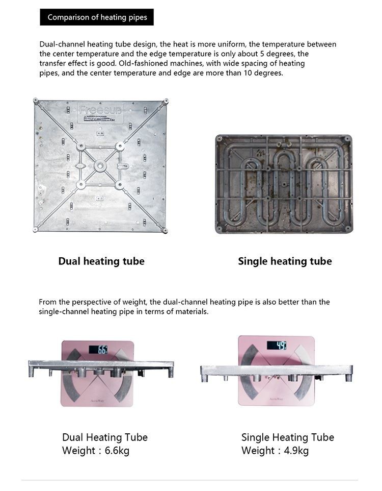 Preas teasa digiteach 15x15, glacann pláta téimh alúmanam soladach feadán dúbailte, chun an téamh a dhéanamh níos cothroime agus is féidir leis an éifeacht priontála a dhéanamh níos fearr. Toisc nach bhfuil an difríocht teochta ach thart ar 5 céim ón Lár agus ón imeall, agus is féidir leis an difríocht dearadh sean-meaisín a bheith 10 gcéim níos mó.
